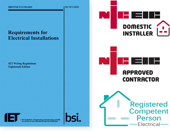 We also hold all the technical qualifications required by the Institute of Engineering & Technology (I.E.T.) and The Department for Communities and Local Government – DCLG – to comply with Building Regulations Part P. We are NICEIC (National Inspection Council for Electrical Installation Contracting) Approved Contractors. |